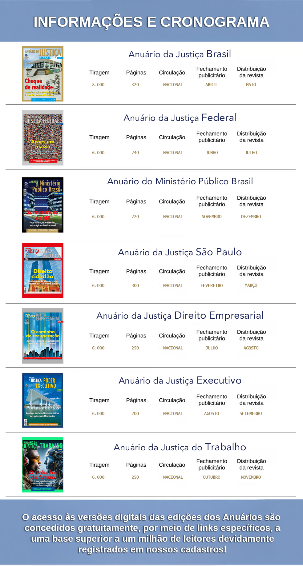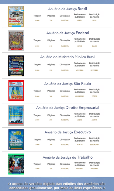 O Anuário fica um ano inteiro nas mesas mais importantes da República. Você estará muito bem acompanhado. Os melhores escritórios de advocacia do Brasil e grandes empresas estão lá, com uma mensagem sóbria, inteligente e eficaz para os magistrados, diretores jurídicos, empresários, executivos e jornalistas. Uma parte da tiragem é destinada à distribuição dirigida, gratuita, para as principais autoridades e às maiores empresas brasileiras.